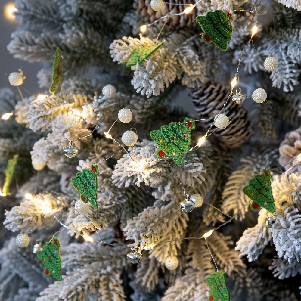 10 елочек, бусины и 20 лампочек с теплым светом. Работает от 2 батареек АА (в комплект не входят).