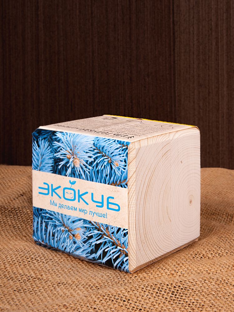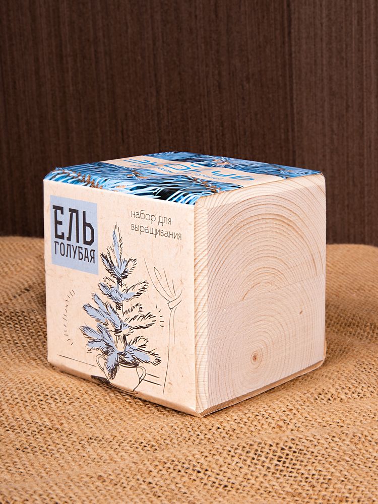 В наборе: деревянный куб, грунт, семена голубой ели.