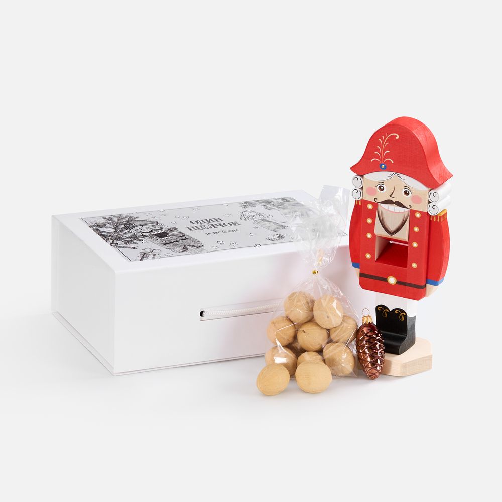 В комплекте: подарочная коробка, наполнитель, орехокол, елочная игрушка и орехи