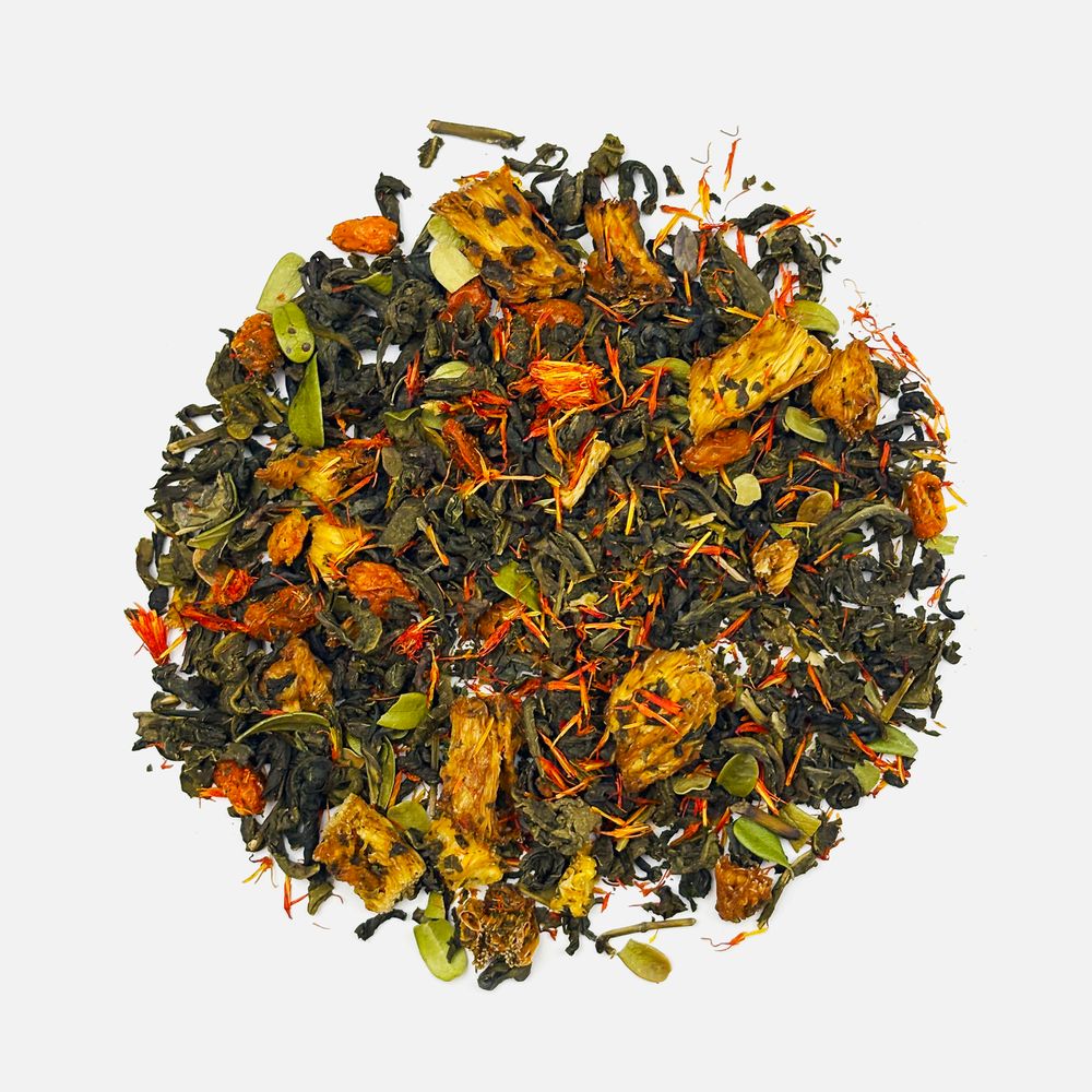 Состав: чай зеленый с ананасом и соком ананаса (чай зеленый байховый крупнолистовой, кусочки ананаса, сок ананаса), цветки сафлора, толокнянка, облепиха сублимированная, ароматизатор натуральный Персик, ароматизатор натуральный Груша.