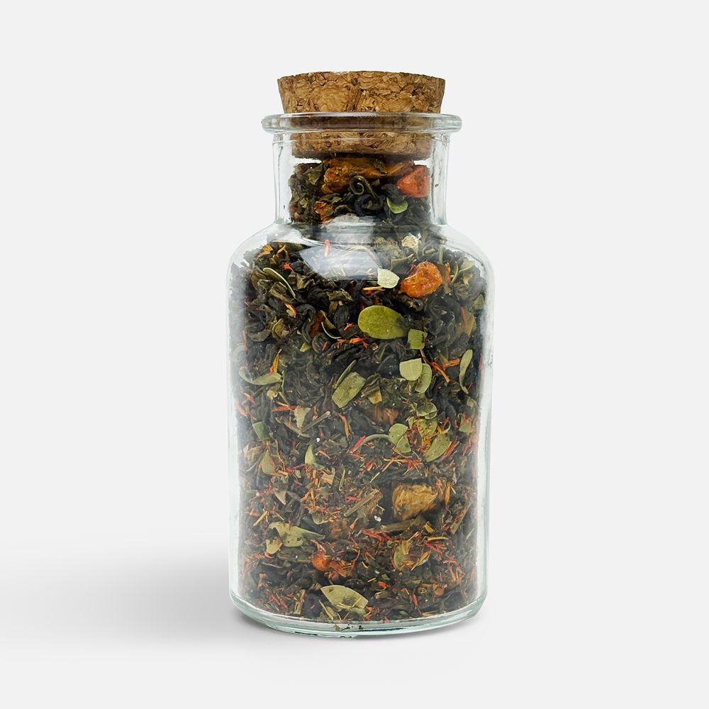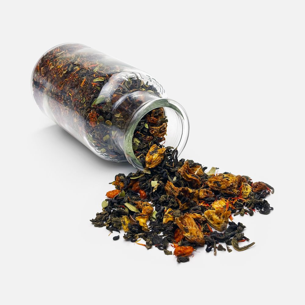 Состав: чай зеленый с ананасом и соком ананаса (чай зеленый байховый крупнолистовой, кусочки ананаса, сок ананаса), цветки сафлора, толокнянка, облепиха сублимированная, ароматизатор натуральный Персик, ароматизатор натуральный Груша.