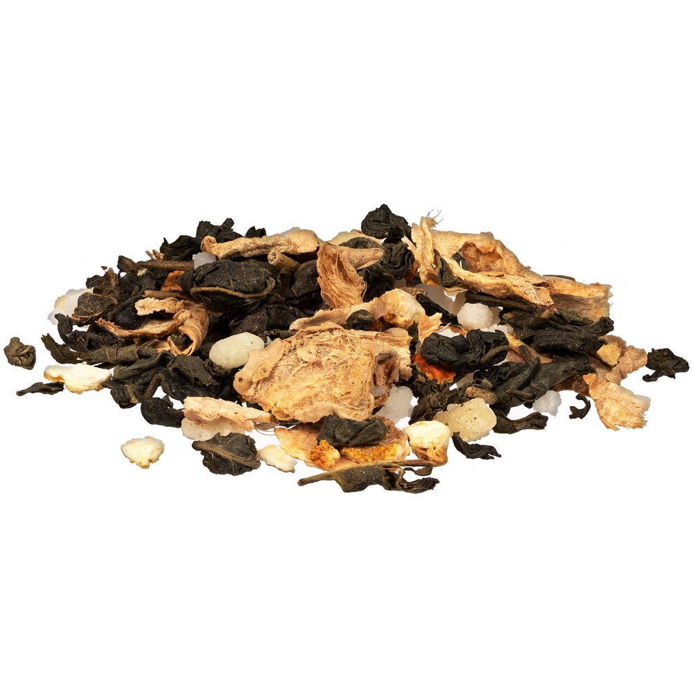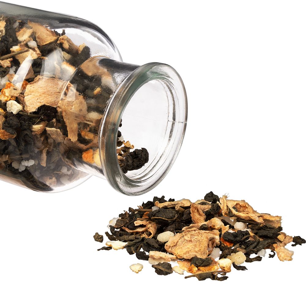 Состав: чай зеленый с имбирем, соком имбиря (чай зеленый байховый крупнолистовой, кусочки имбиря, сок имбиря), медовые гранулы, апельсиновая цедра сушеная, ароматизатор натуральный «Апельсин».