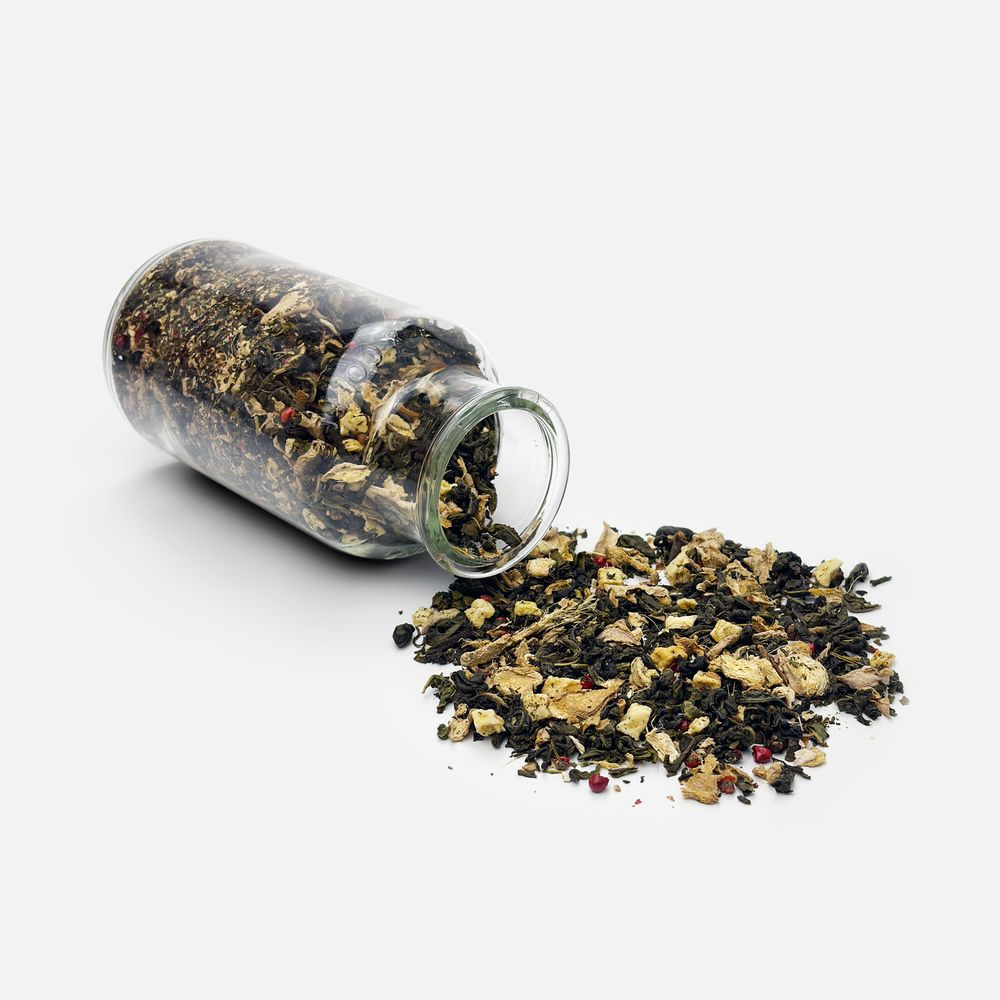 Состав: чай зеленый с имбирем и соком имбиря (чай зеленый байховый крупнолистовой, кусочки имбиря, сок имбиря), яблоко сублимированное, розовый перец, гвоздика, ароматизатор Персик, ароматизатор Яблоко.