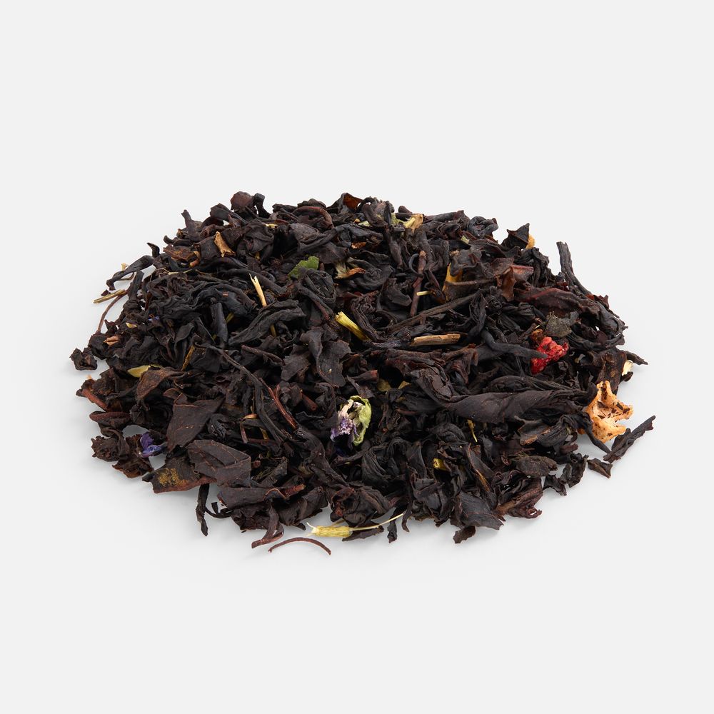 Состав: черный индийский чай, сушеная клубника, клубничный лист, цветки василька, ароматизатор «клубника».