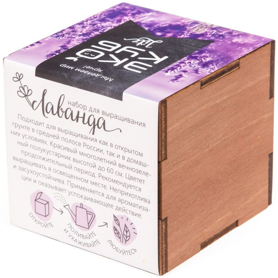 В наборе: деревянный куб, бумажный стаканчик, питательный грунт, семена, вермикулит.