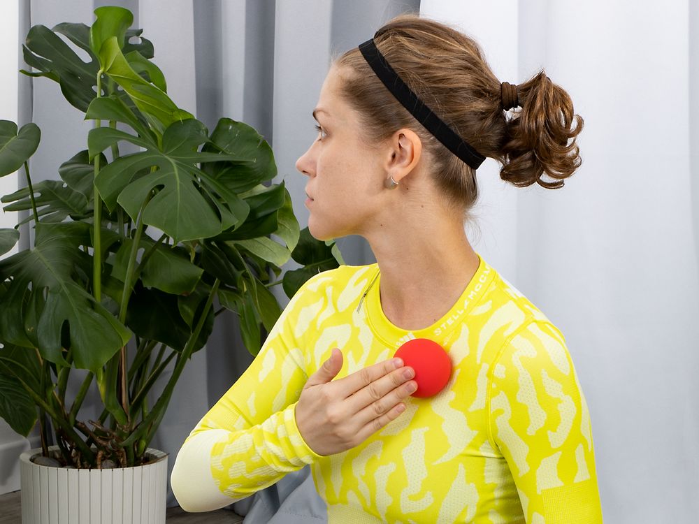 Разместите мяч на точке, в которой чувствуется дискомфорт, надавите и прокатывайте его из стороны в сторону в течение нескольких минут до ощущения расслабления. Рекомендуется применять при умеренных болевых ощущениях.