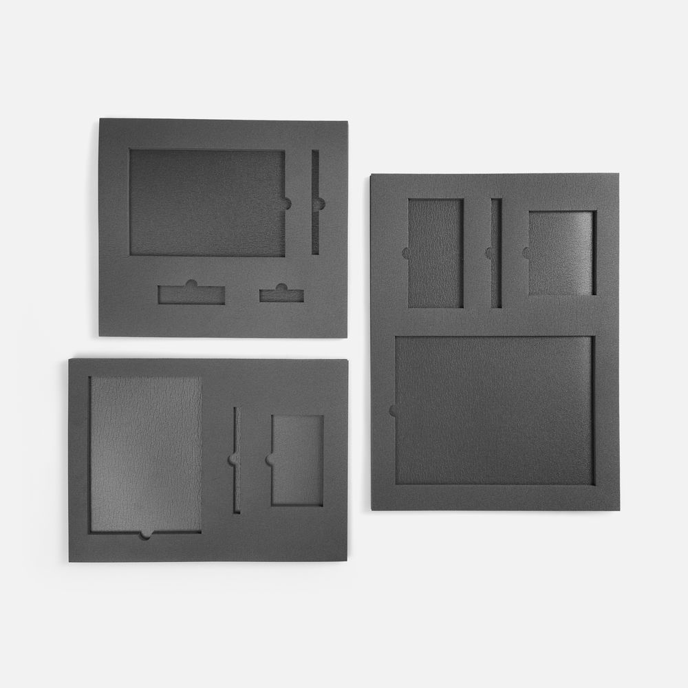 Ложемент, изготовленный из материала Izolon 500 черного цвета, представляет собой многослойную конструкцию, состоящую из нижнего слоя толщиной 5 мм и верхнего слоя толщиной 10 мм. В соответствии с утвержденным макетом, проемы для размещения предметов могут быть спроектированы как в одном, так и в обоих слоях.
