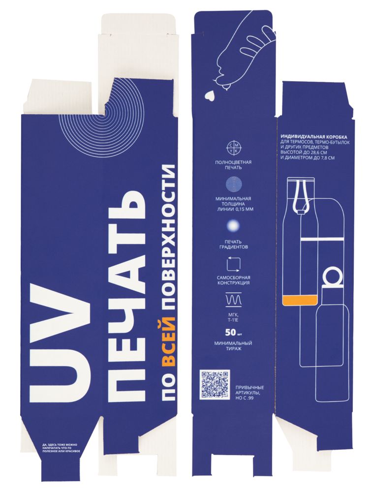 В стоимость входит полноцветная печать с лицевой стороны. Печать производится на UV-плоттере непосредственно на листе картона, минуя стадию каширования.
