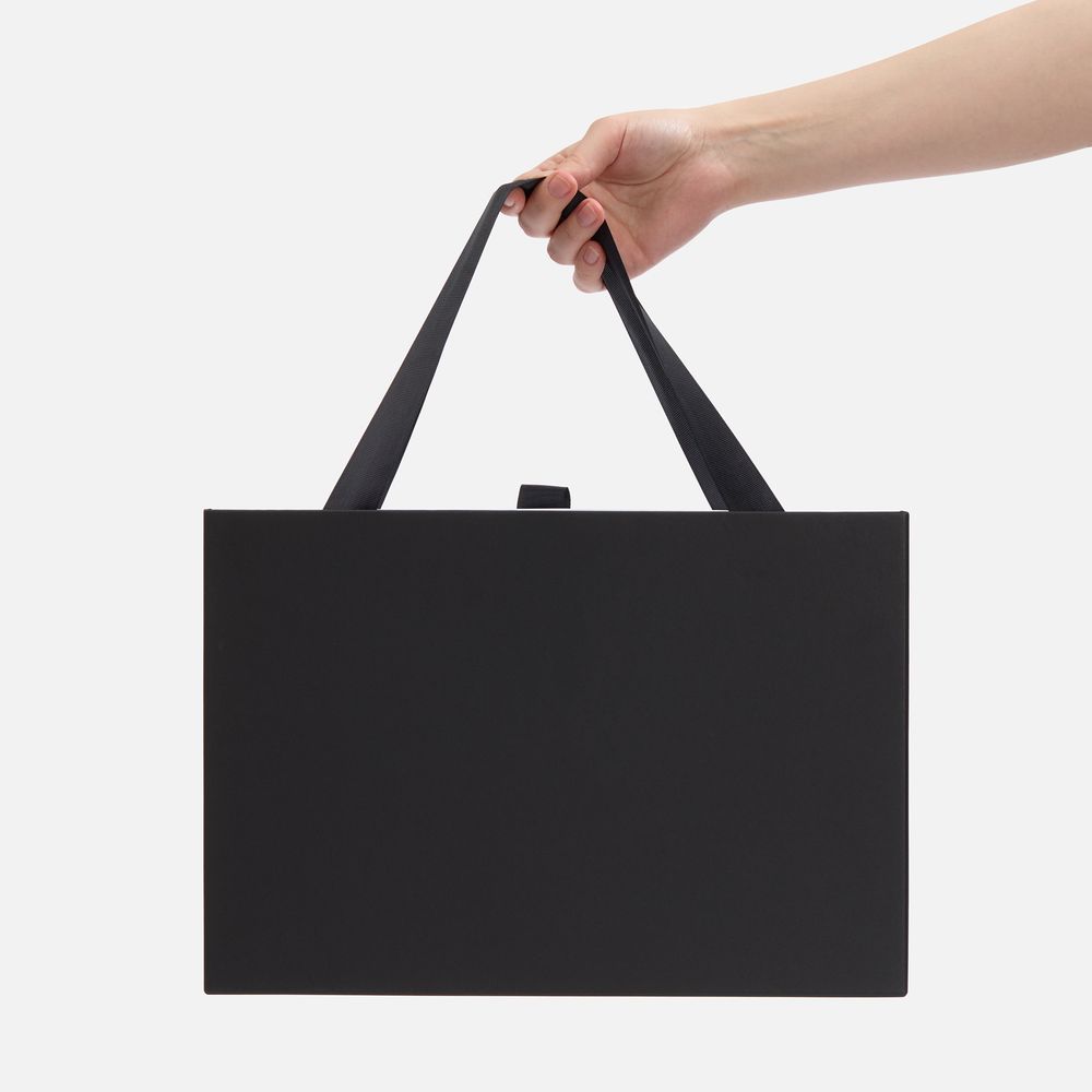 Внешний короб каширован дизайнерской бумаги и оснащен прочными ручками из репсовой ленты. Внутренний короб отделан белой бумагой, ламинированной матовой пленкой.