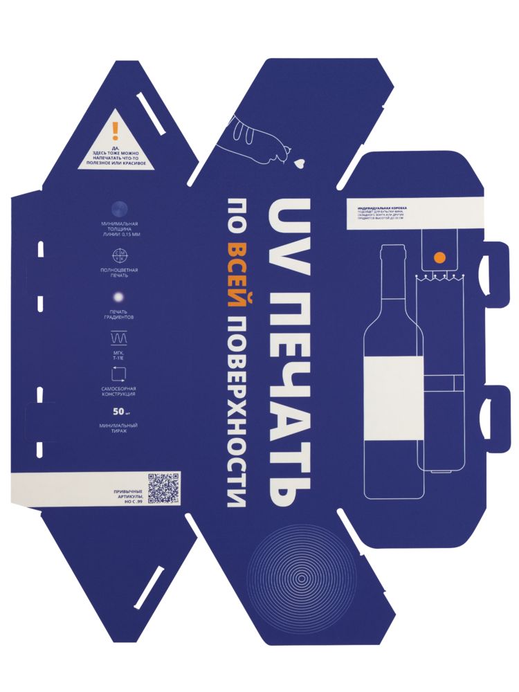 В стоимость входит полноцветная печать с лицевой стороны. Печать производится на UV-плоттере непосредственно на листе картона, минуя стадию каширования.